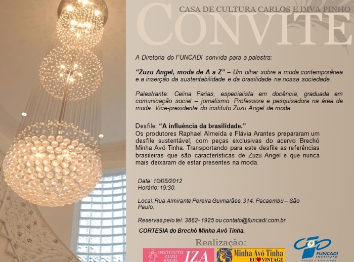 Diaá10 de maio,áCelina de Farias, vice-presidente doáInstituto Zuzu Angel, darß uma palestra sobre ááZuzu Angeláeásua influÛncia na moda contemporÔnea brasileira, naáCasa de Cultura Carlos e Diva Pinho. O evento, que tem como proposta unir moda e sustentabilidade ,áainda contarß com um desfile de peþas do acervoáBrech¾ Minha Av¾ Tinha, inspirado na brasilidadeáfashionáde Zuzu. Se vocÛ mora emáSÒo Pauloáou estiver por lß nesta data, nÒo deixe de conferir!... ;)